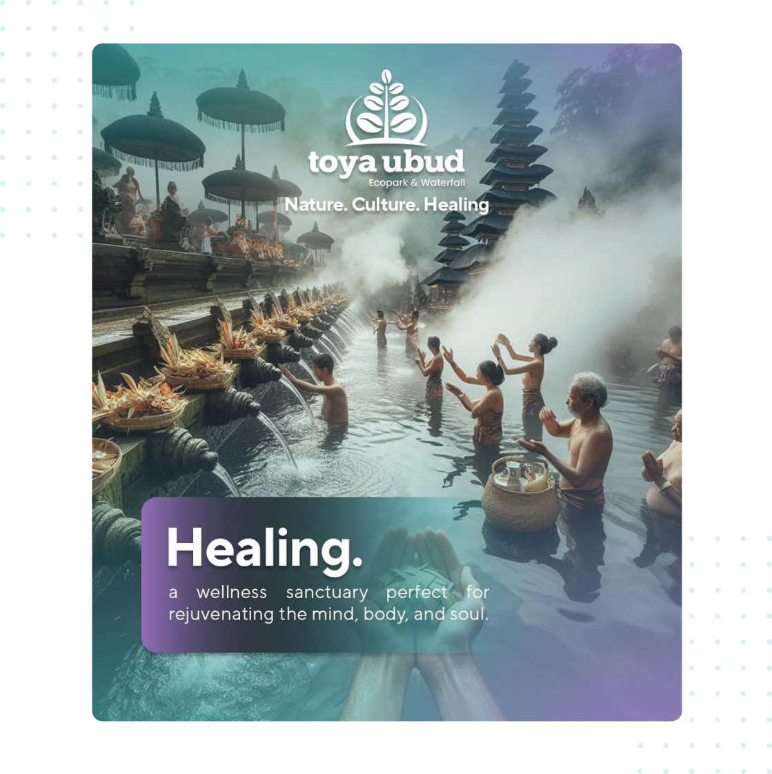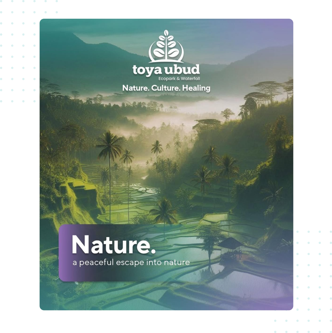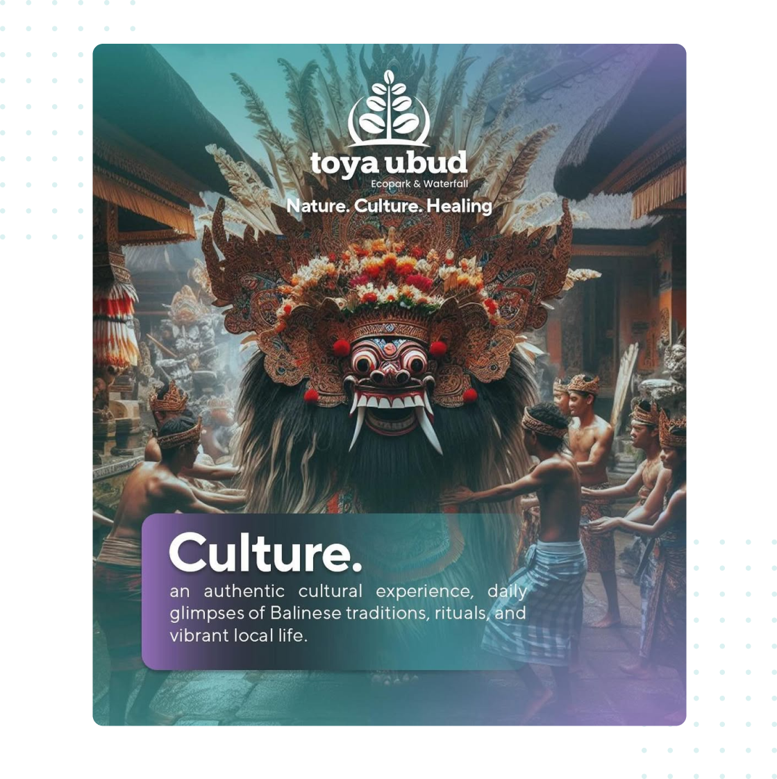 A land where fairytale and daily tradition intertwine, weaving a mosaic of wonder and meaning that inspires the future. Nestled in Kenderan Village, this is where the beauty of nature and the richness of culture come together, sparking creativity and nurturing dreams that transcend time.We bring together the best of nature, culture, and healing in one serene destination. Surrounded by lush landscapes, you'll experience the beauty of Bali’s natural wonders, while our rich cultural heritage inspires every aspect of your stay.